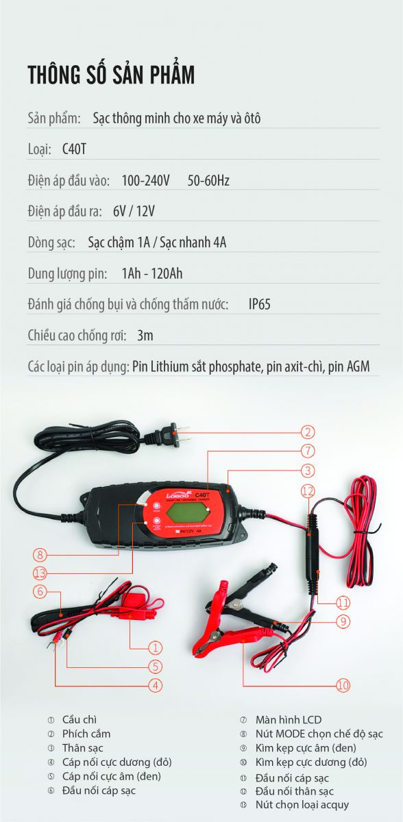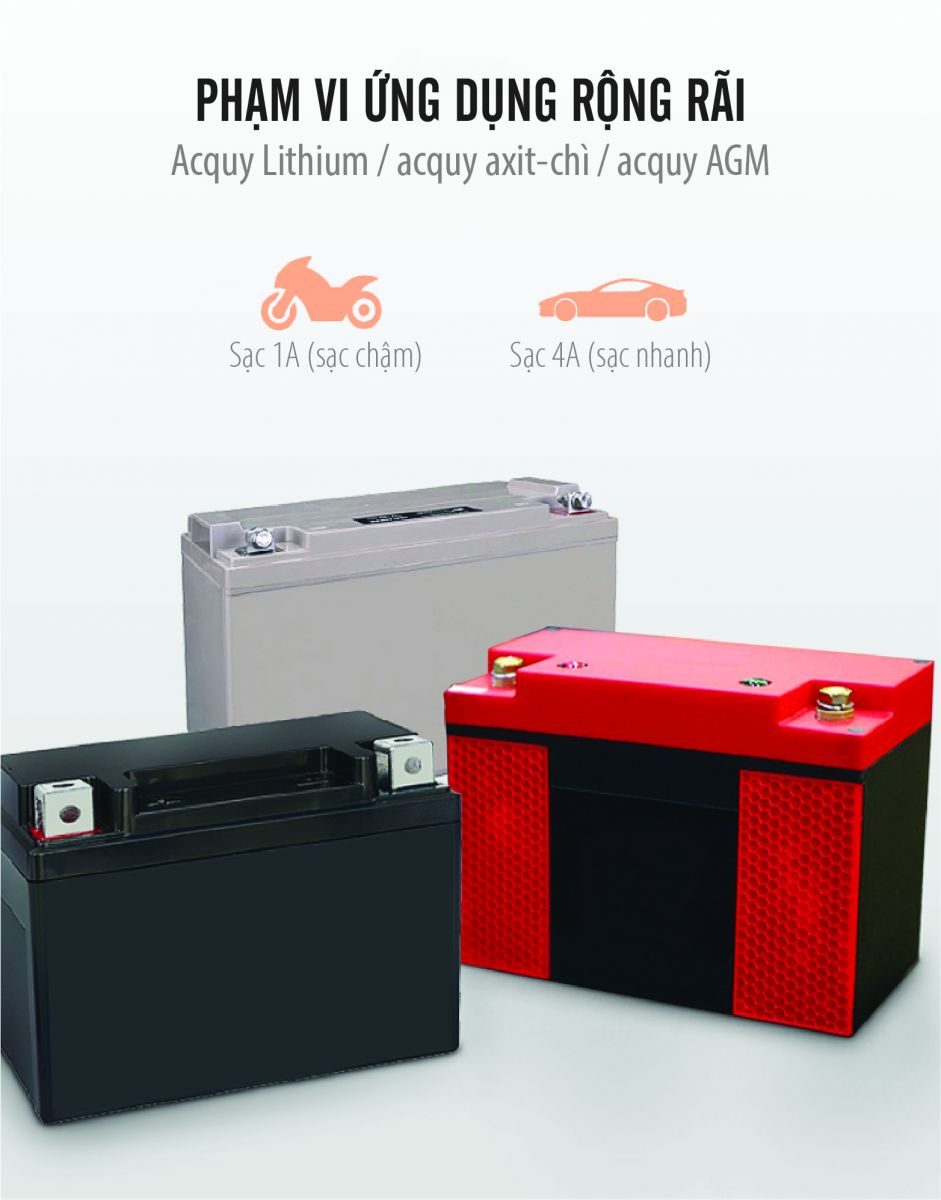 - Tương thích với hầu hết các loại ắc quy: Lithium, axit-chì, AGM...