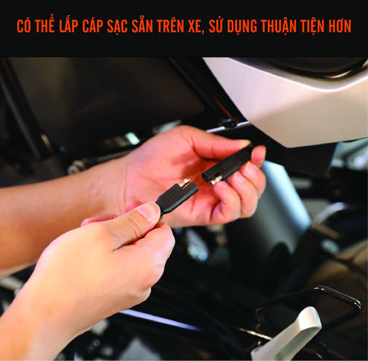 - Có cáp nối sẵn từ ắc quy để cắm vào sạc.