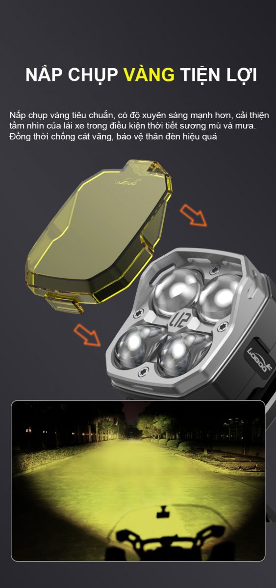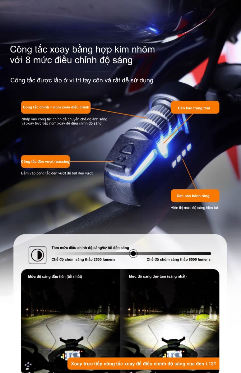 + Khi điện áp ắc quy thấp hơn 11,5V do quá tải hoặc xe gặp vấn đề, đèn sẽ tự động giảm độ sáng xuống mức 6. Khi điện áp ắc quy tăng, có thể tăng độ sáng bằng con lăn.