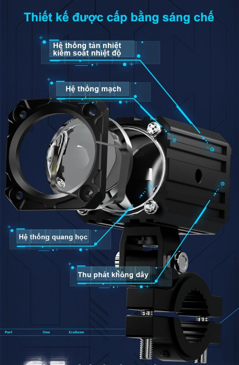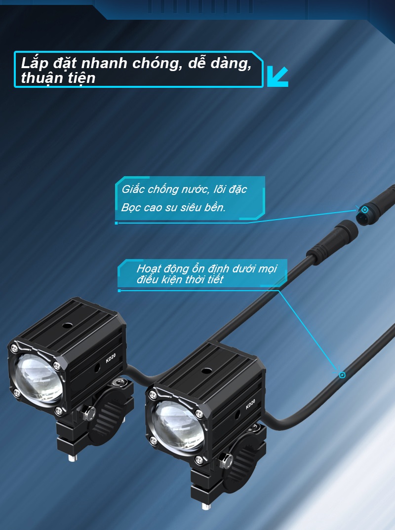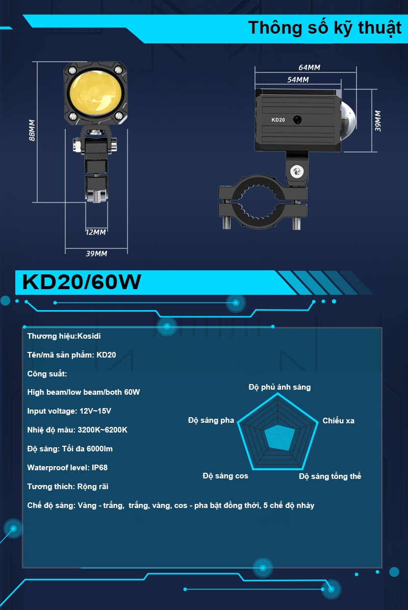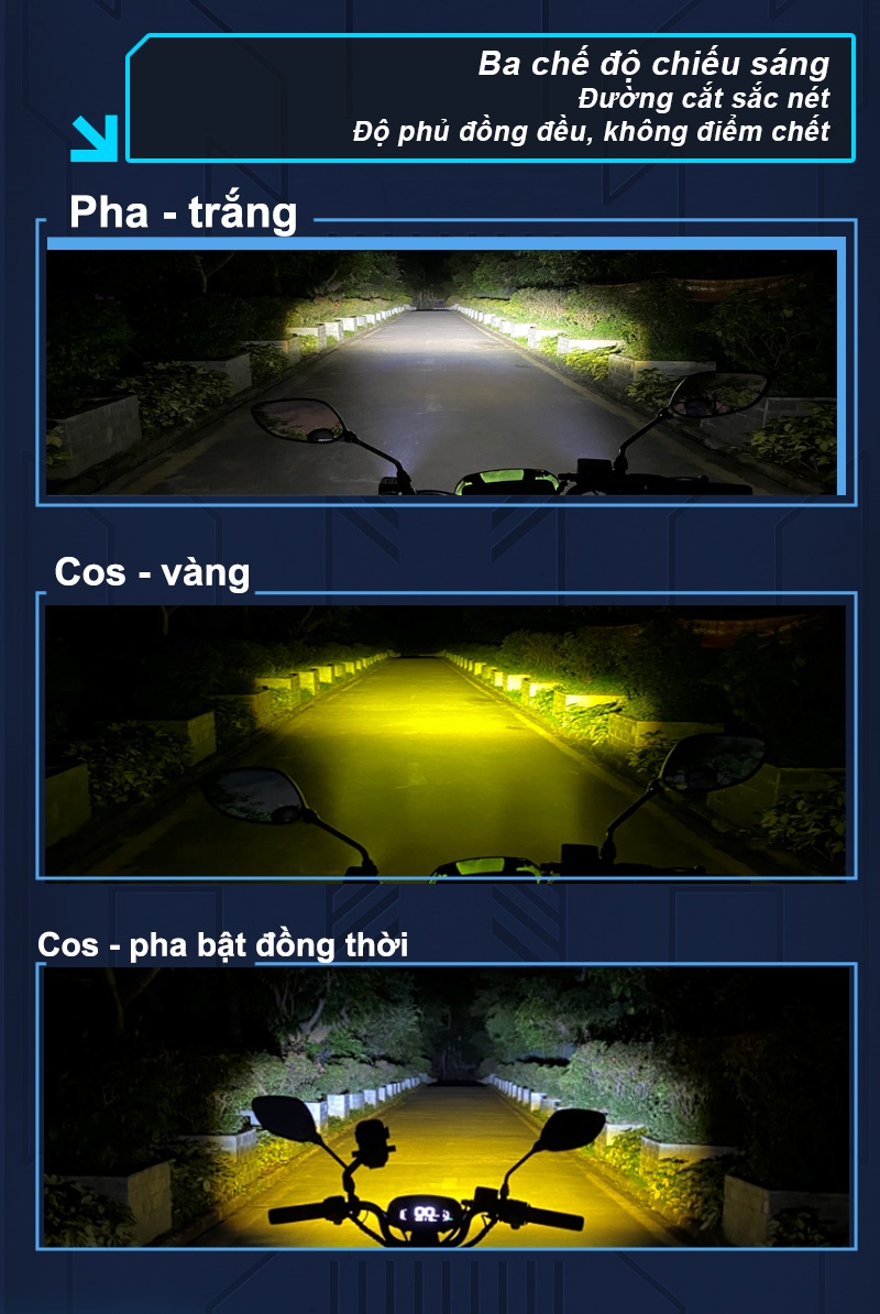 Nhiệt độ màu: pha trắng 6000K, cos vàng 2800K, pha + cos 4000K