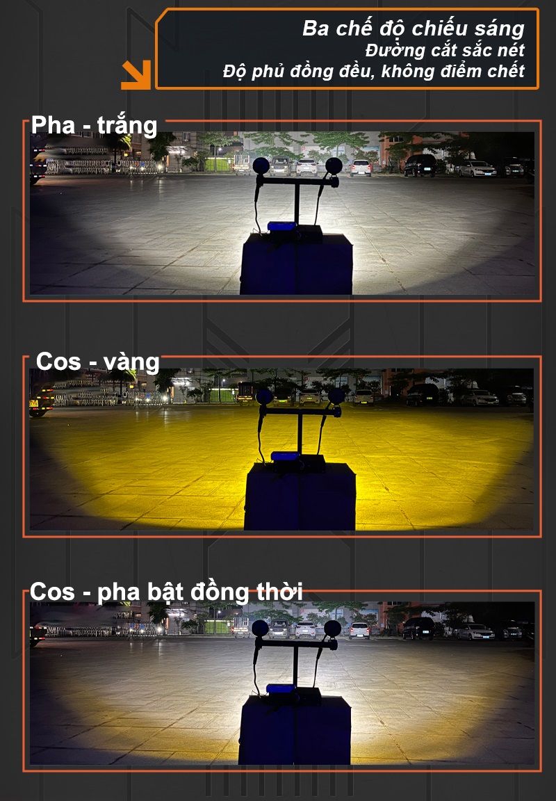 Nhiệt độ màu: pha trắng 6000K, cos vàng 2800K, pha + cos 4000K