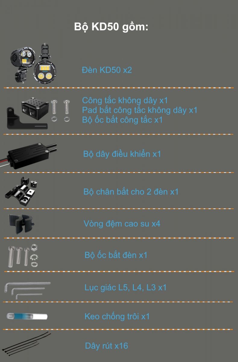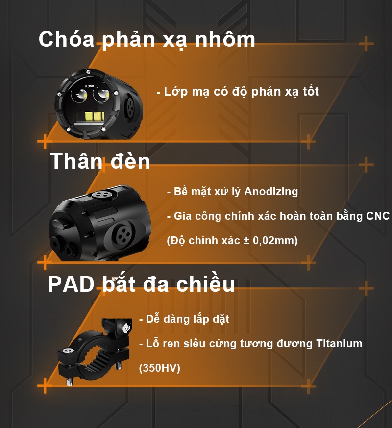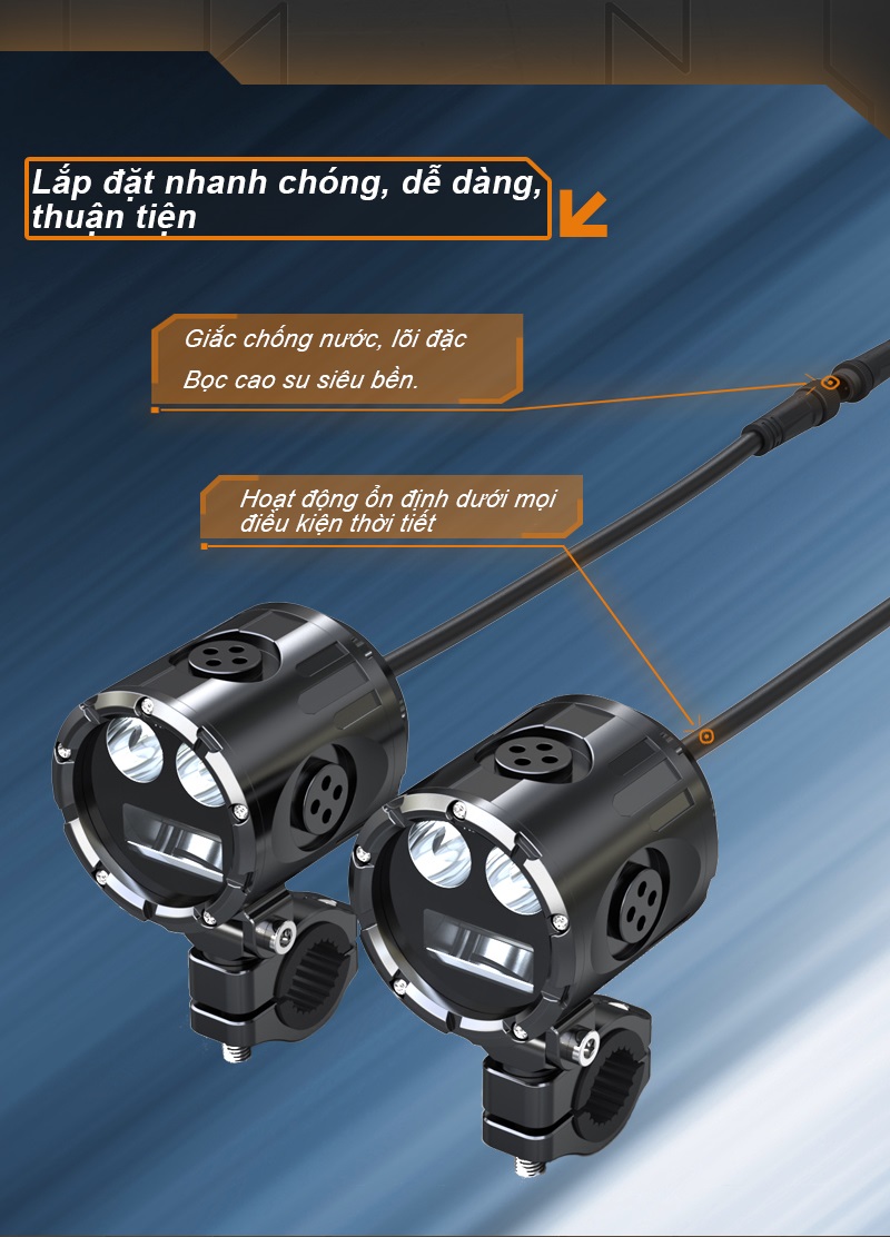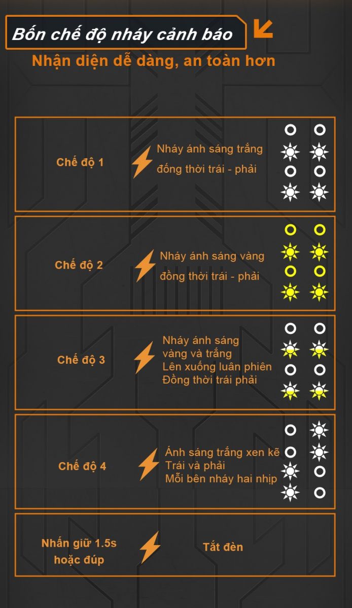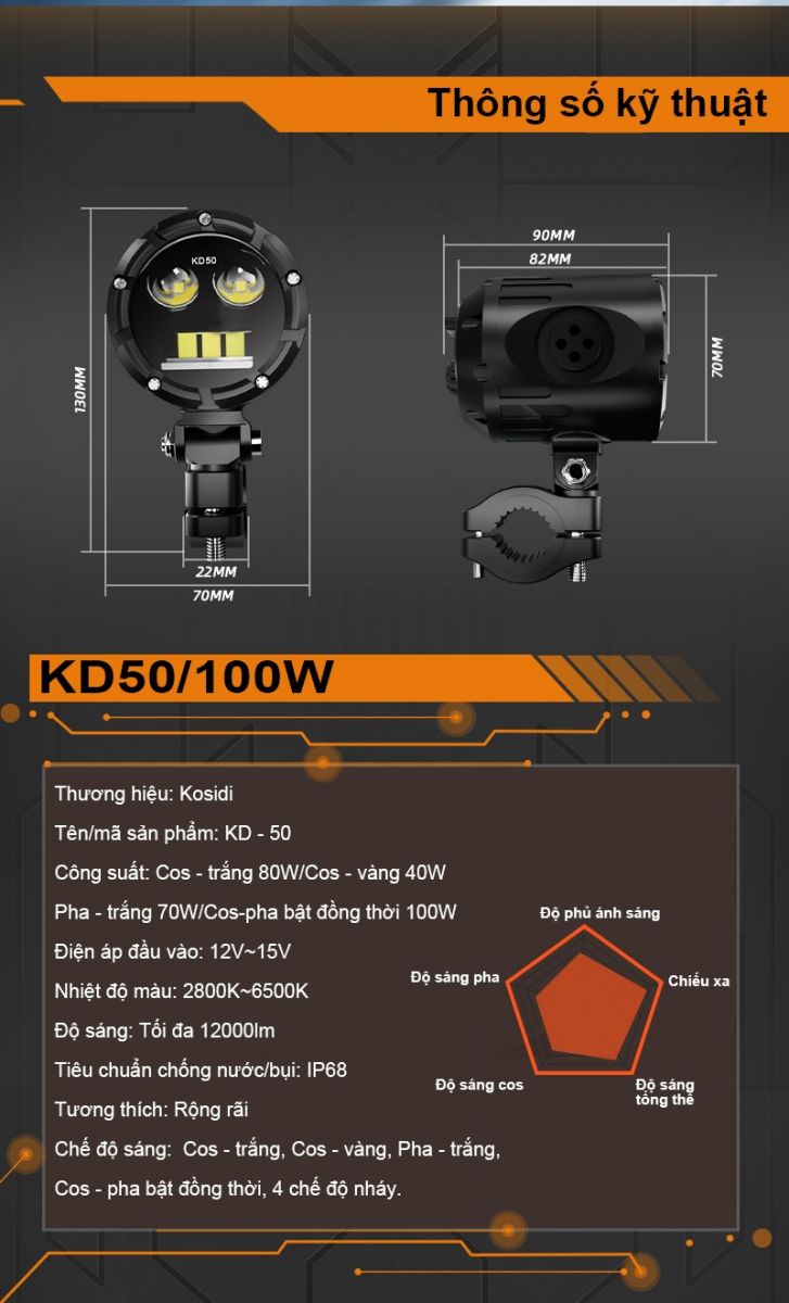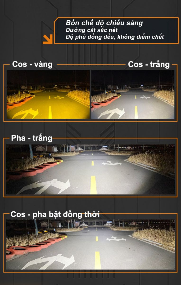 Độ sáng: pha 8000lm/cặp, cos trắng 9000lm/cặp, cos vàng 5000lm, pha + cos 12.000lm/cặp