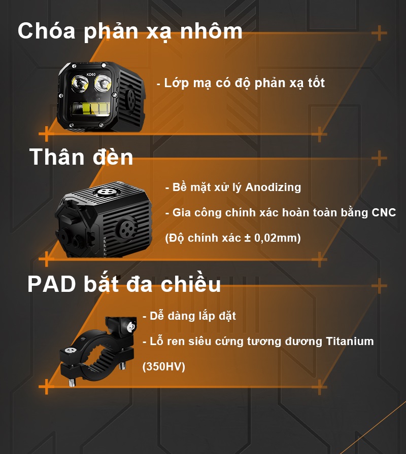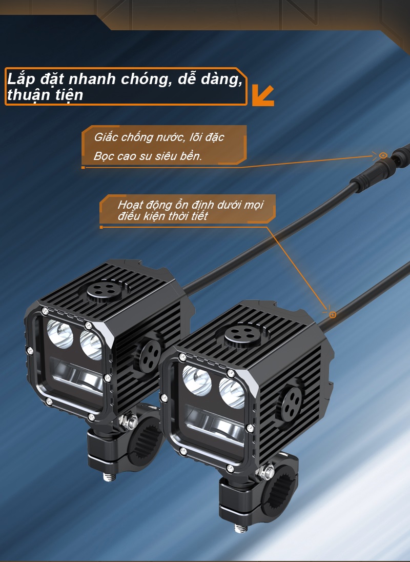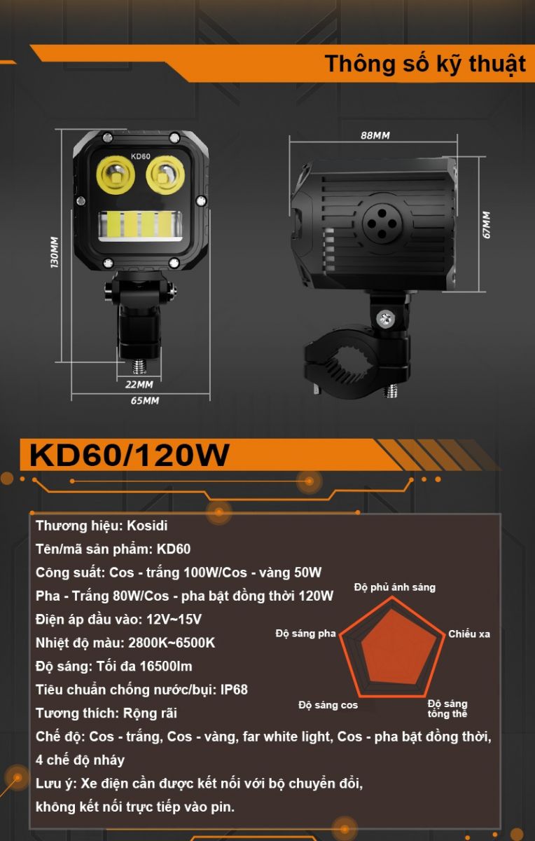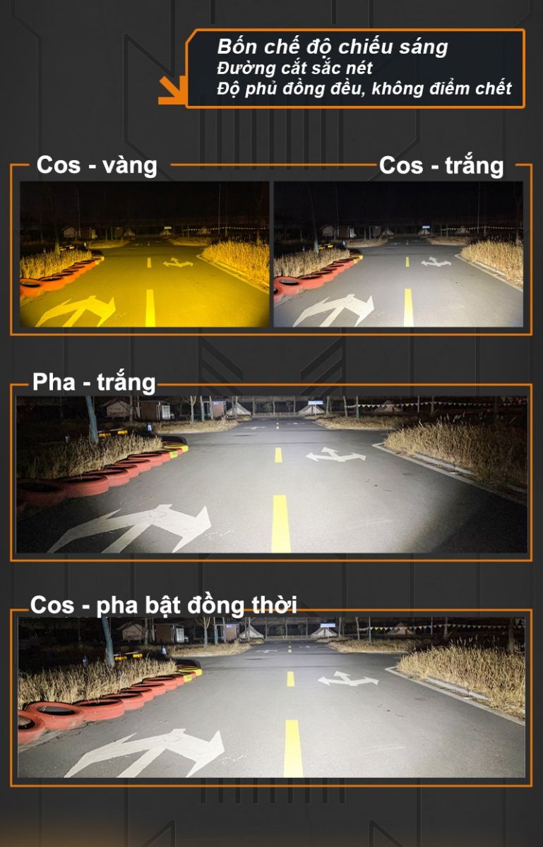 Độ sáng: pha 10.000lm/cặp, cos trắng 12.000lm/cặp, cos vàng 6000lm, pha + cos 14.500lm/cặp