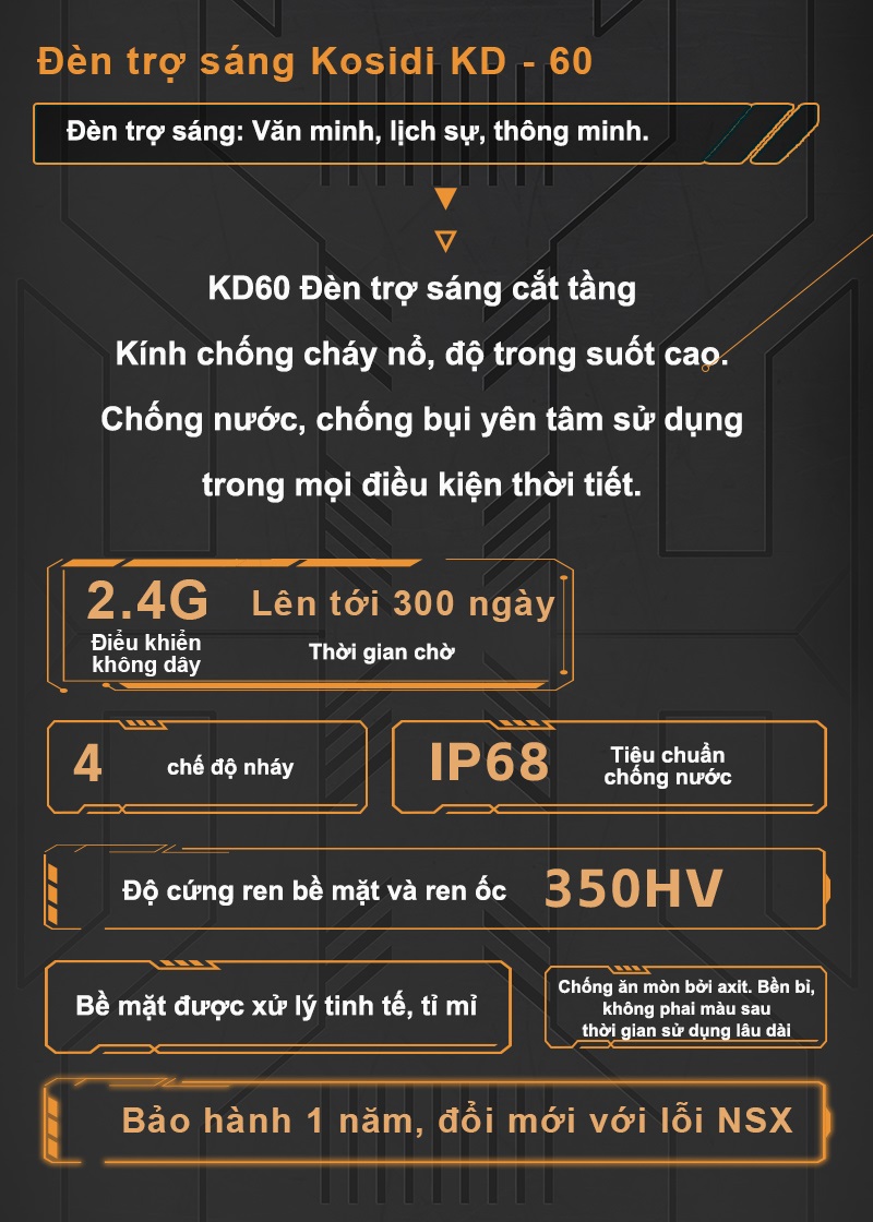 Nhiệt độ màu: pha trắng 6000K, cos trắng: 5000K, cos vàng 2800K, pha + cos 4000K
