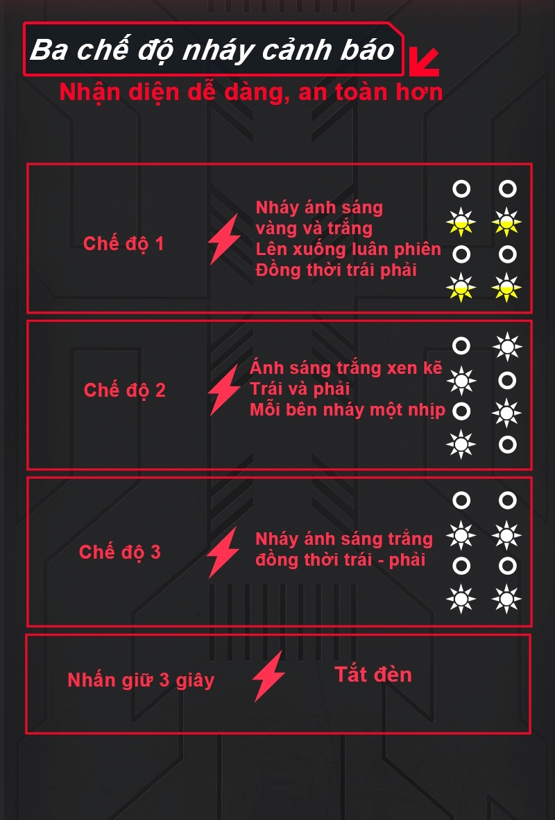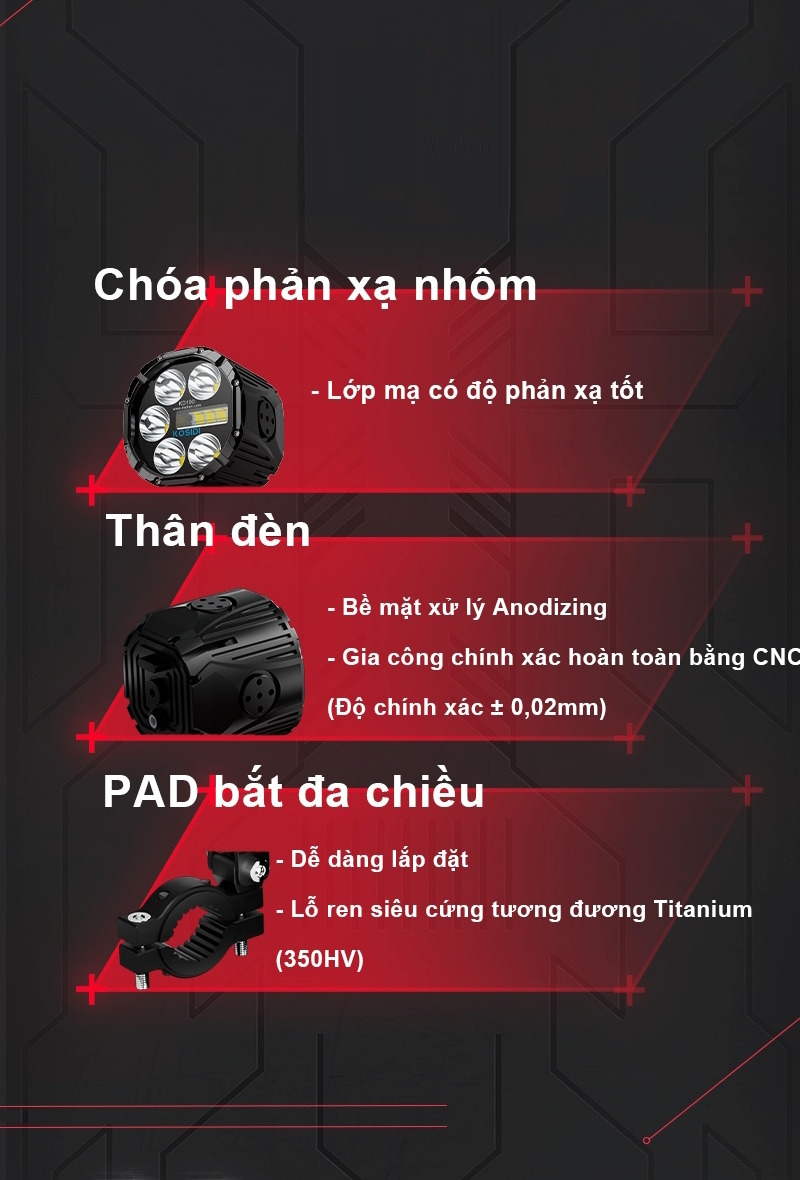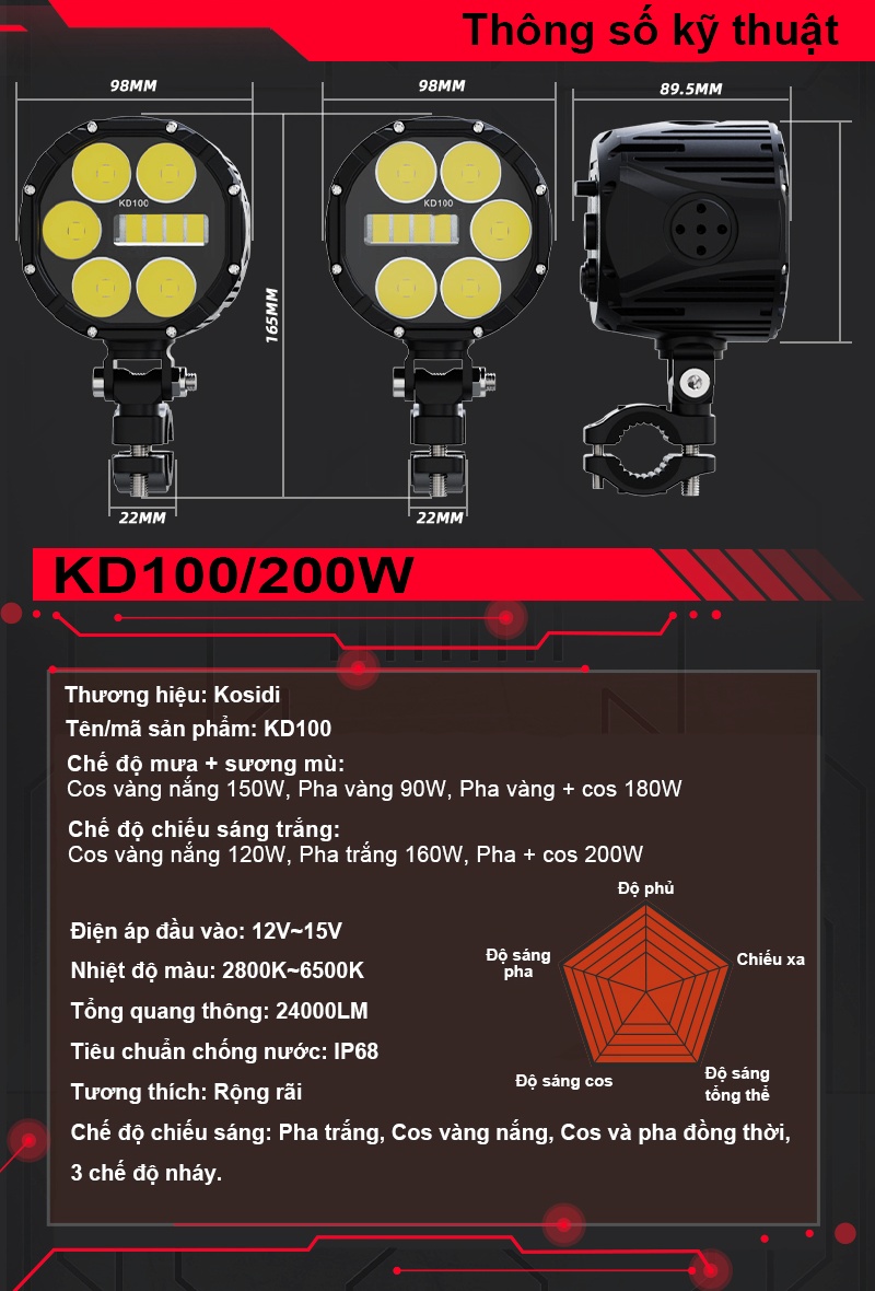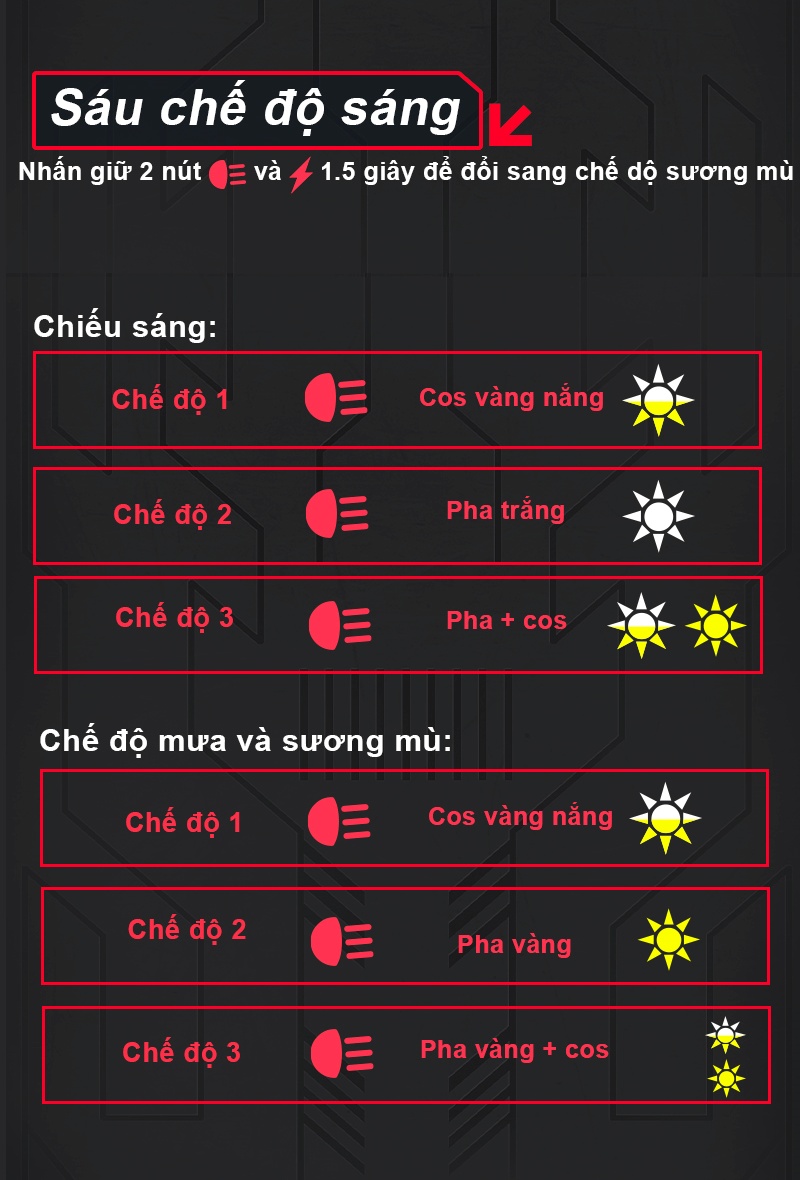 Độ sáng: pha trắng 16.500lm/cặp, pha vàng 11.000lm/cặp, cos trắng 14.000lm/cặp, cos vàng 7000lm, pha trắng + cos trắng 24.000lm/cặp