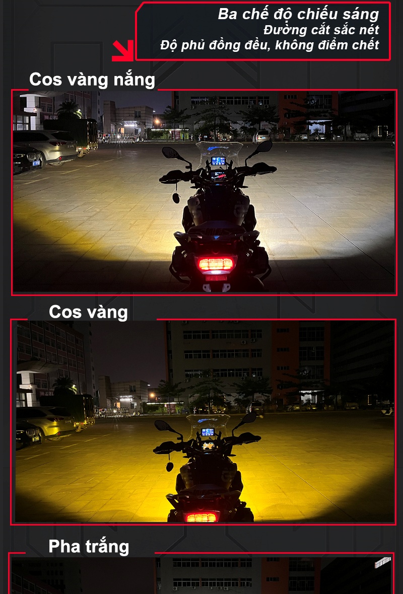 Nhiệt độ màu: pha trắng 6000K, cos trắng: 5000K, cos vàng 2800K, pha + cos 4000K