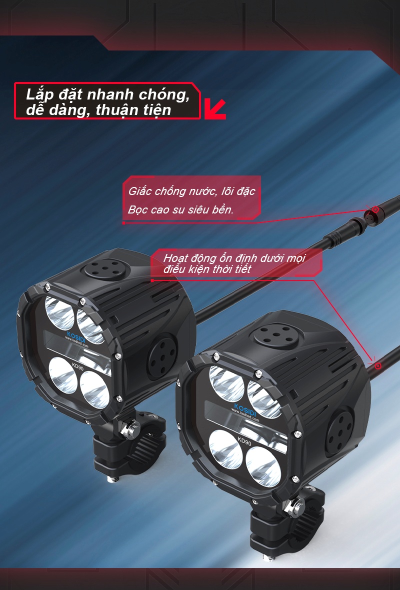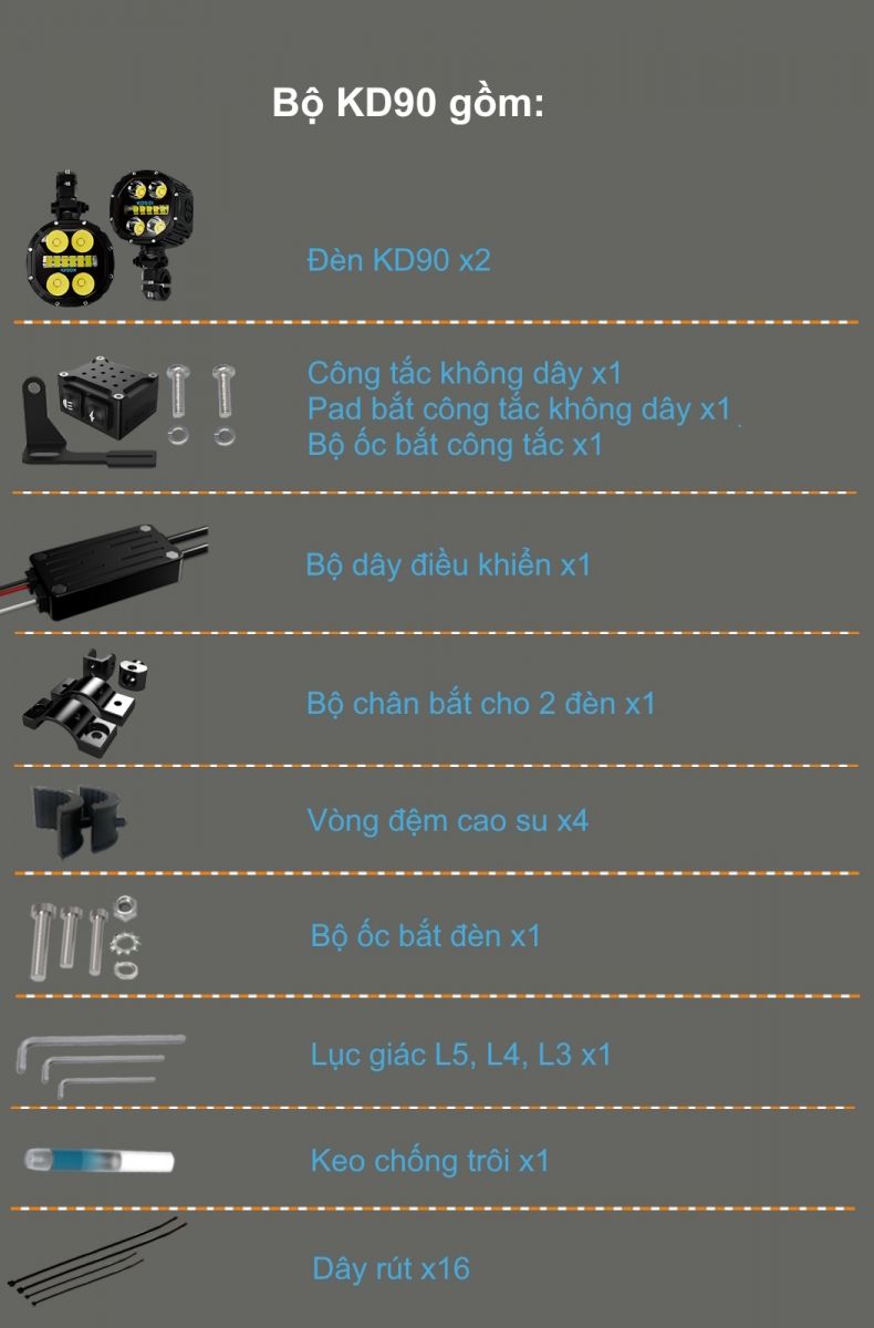 Công suất: pha trắng 90W/cặp, pha vàng 90W/cặp, cos trắng 120W/cặp, cos vàng 60W/cặp, pha trắng + cos trắng 195W/cặp