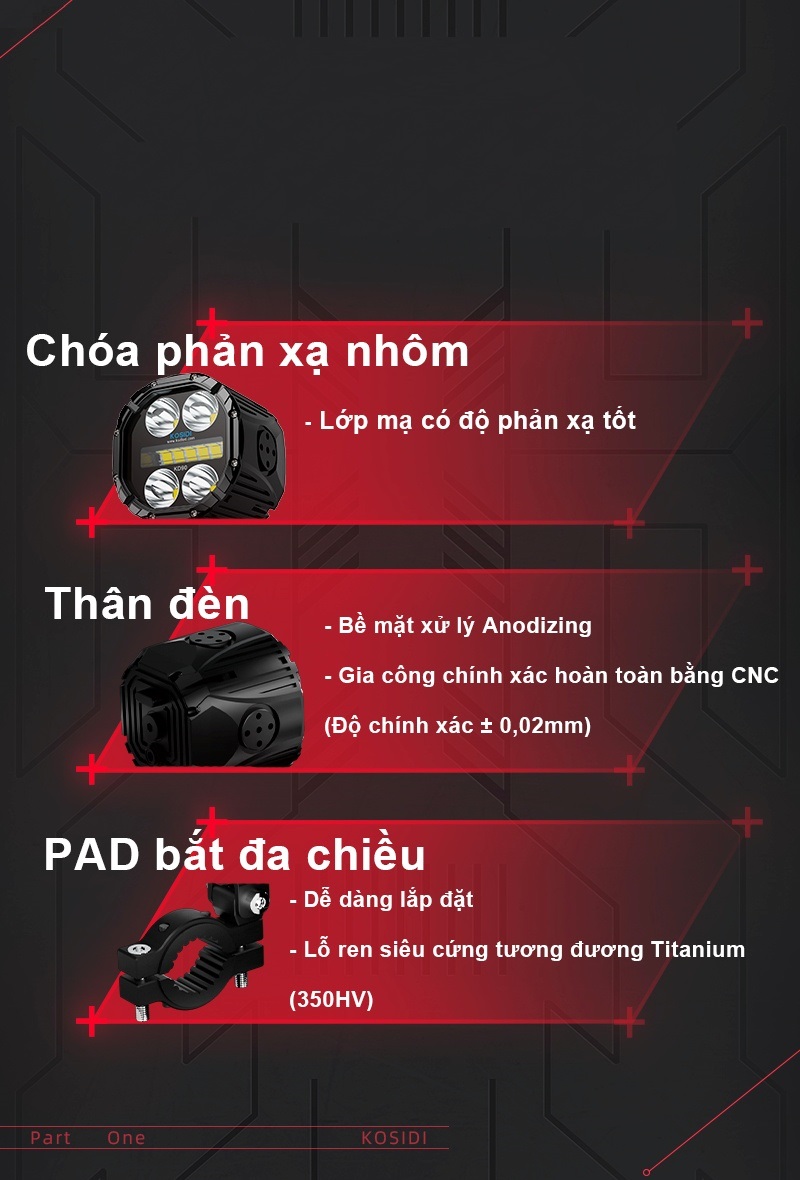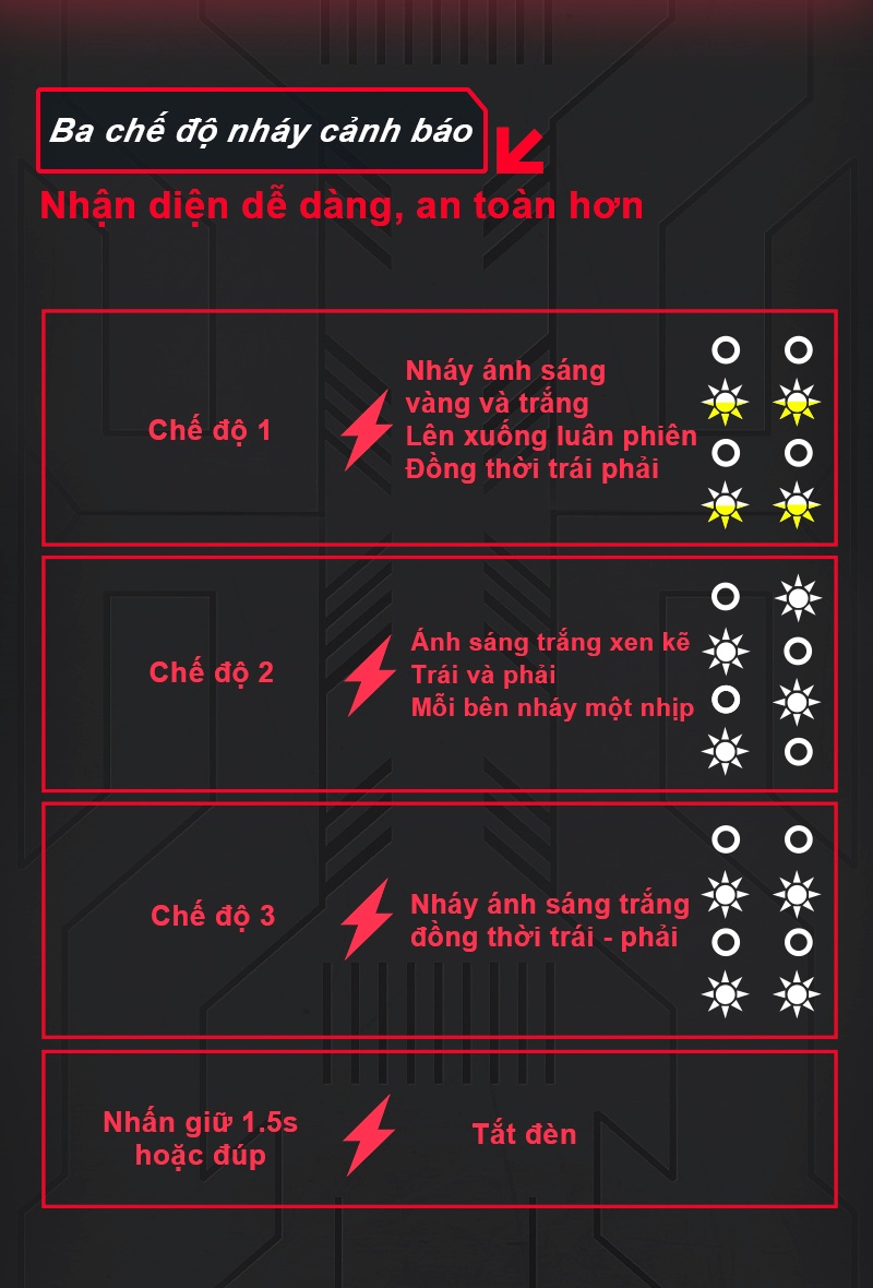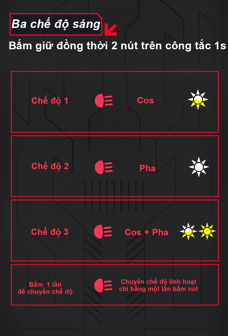 Độ sáng: pha trắng 11.000lm/cặp, pha vàng 11.000lm/cặp, cos trắng 14.500lm/cặp, cos vàng 7000lm, pha trắng + cos trắng 23.500lm/cặp